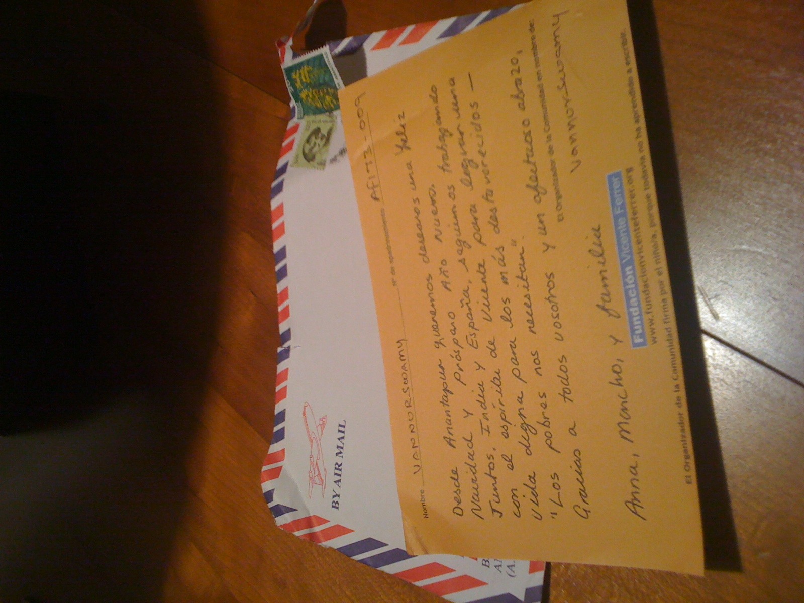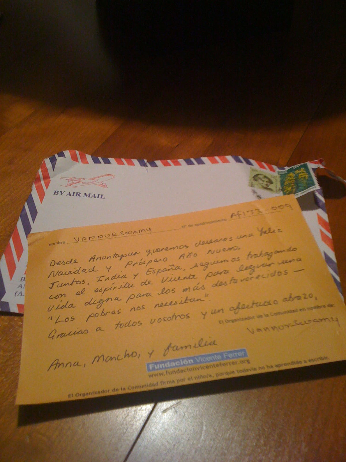 Esta tarde he recibido la primera felicitación de este año. El organizador de la comunidad de la aldea Vicente Ferrer, en Anantapur (INDIA), nos escribe en nombre de nuestro ahijado, felicitando las navidades y recordánonos el enorme trabajo que realizan allí.