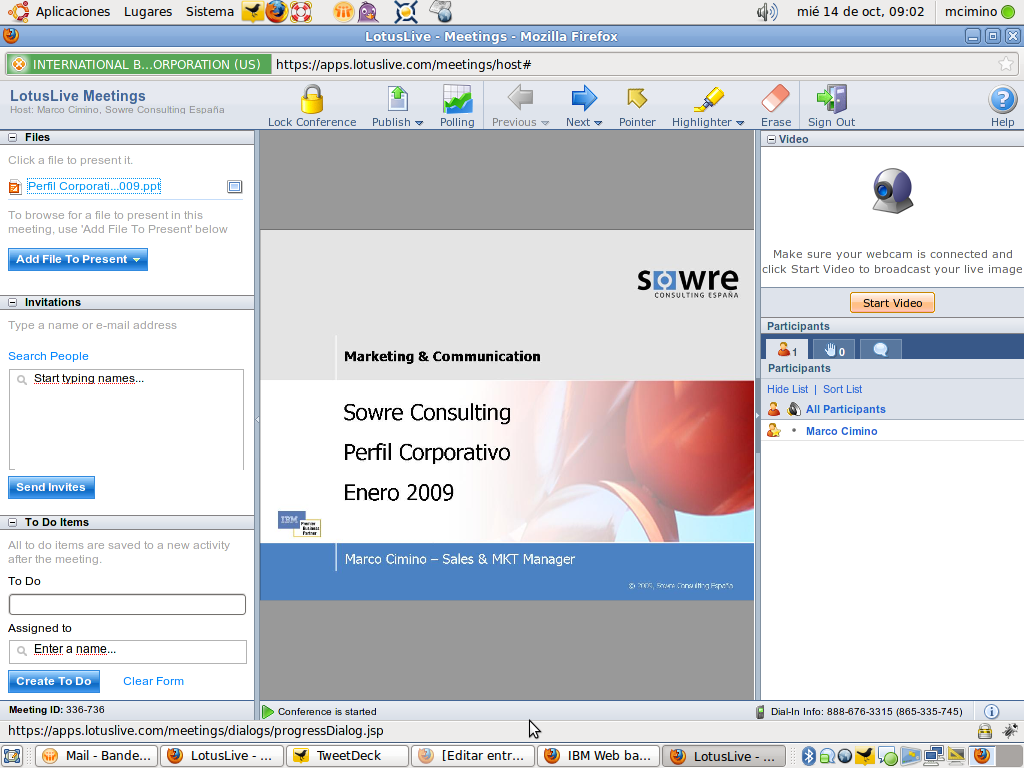 Sin novedades a destacar respeto a Lotus Sametime cuando entramos en la sala de reuniones virtuales: pizarra para escribir, upload documentos para presentar y compartir, char, voz, webcam, votaciones, etc. En este caso accedemos a ella utilizando Firefox 3.5, y sorprendentemente no recibimos ningún mensaje de error ni alerta de funcionalidad limitada debido al navegador. También el resto de funciones trabajan correctamente.